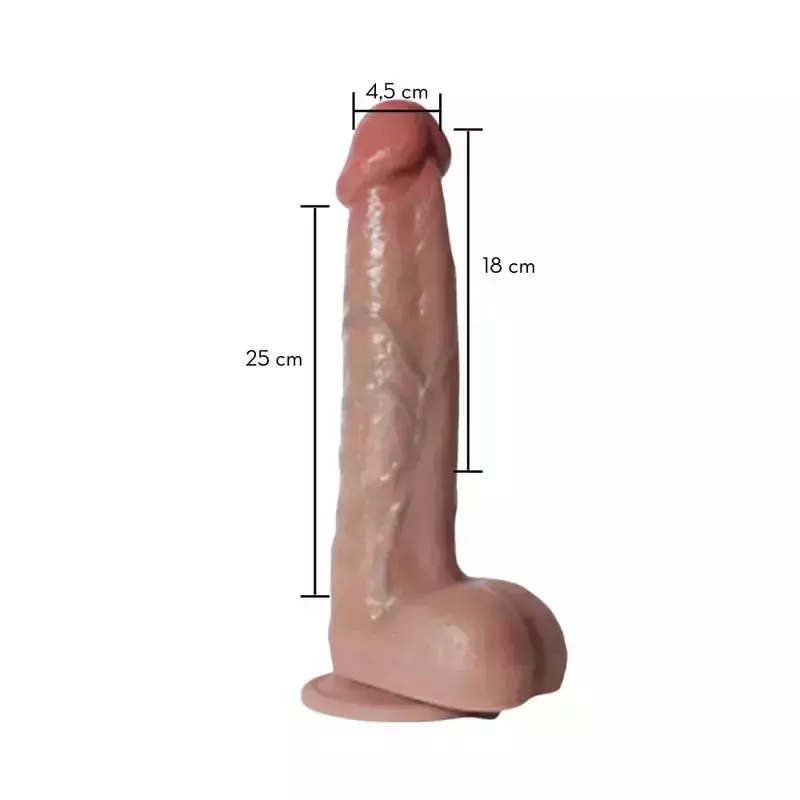 Tamanho ideal: 25 cm de comprimento total (18 cm penetráveis) e glande de 4,5 cm de diâmetro.